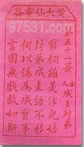 成王,西周国王,年幼丧父,国事暂由王叔周公管理。成王有一天,与弟弟唐叔玩游戏,成王把桐叶剪成圭形,说:“我封你为诸候。”周公知道这件事,便恭喜唐叔。成王却说,开玩笑而已。周公教训他:“君无戏言。”后来,周公东征胜利,巩固了西周的政治势力,并还政于成王,成王大封诸候,果然守信,把唐这地方封给唐叔。此签之含意甚深,凡事要诚恳,慎言,守信,兄弟要和好。